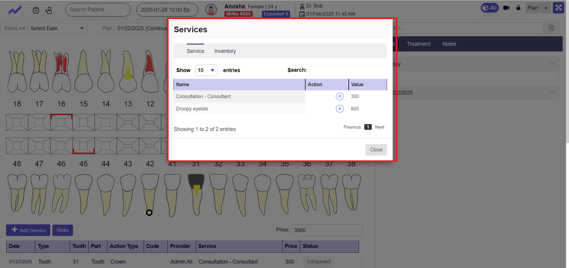Here, we will select the services the patient requires and the operations that need to be performed on the patient’s teeth.