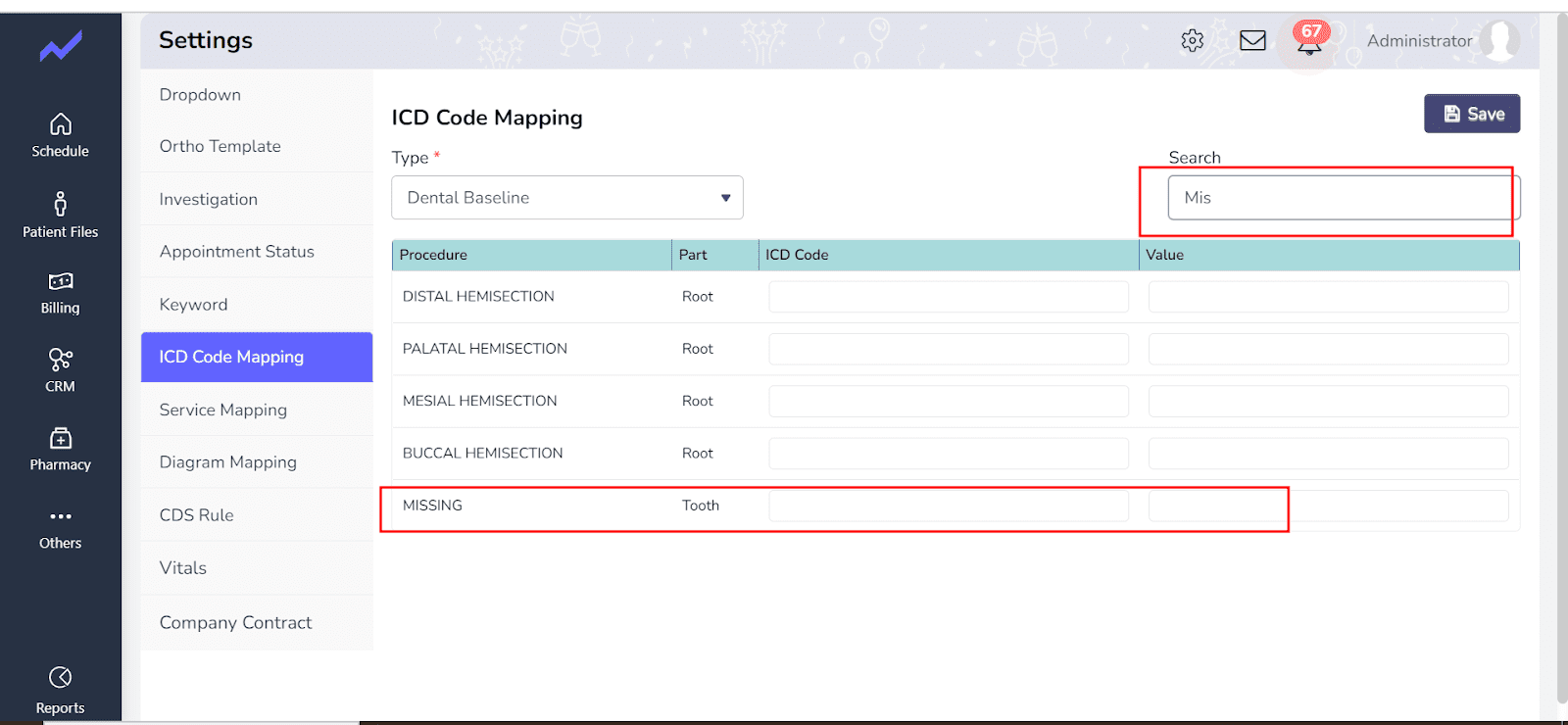 - Select the Type Dental Base and Doctor can search the specific Service In which you want Mapp the ICD Code .